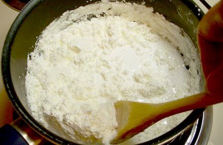 1 – Colocar la fécula de maíz en un recipiente de teflón o enlozado. Incorporar luego la cola vinílica revolviendo con cuchara de madera para disolver los grumos.