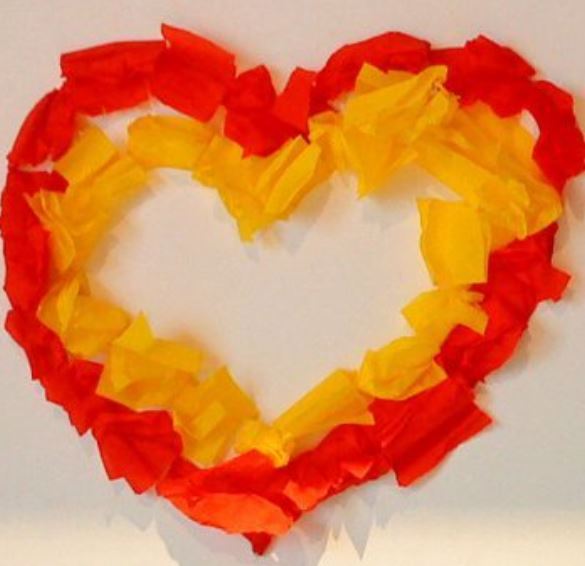 Hacer bolitas con los cuadrados de papel pinocho y ponerlos sobre el corazón, alternando los rojos con los amarillos, hasta cubrirlo completamente. El corazón ya está listo!