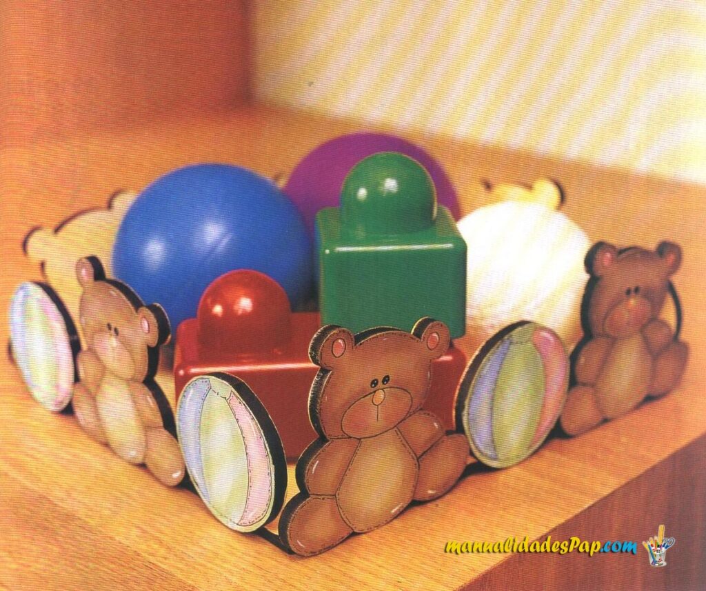 Despliega tu creatividad y amor al pintar estas lindas piezas de madera que te serán muy útiles para adornar la recámara del bebé. Con el mismo motivo de osos y pelotas puedes encontrar la cenefa, el picaporte y la caja para accesorios.