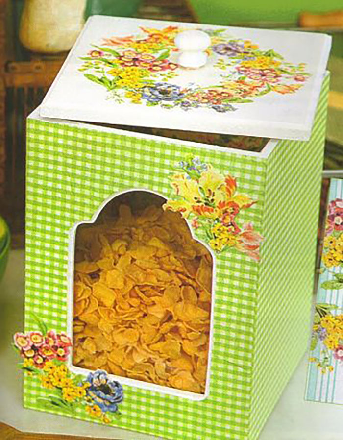 Un cuardille bien vibrante en un tarro de cocina con flores en decoupage con porcelana fria.