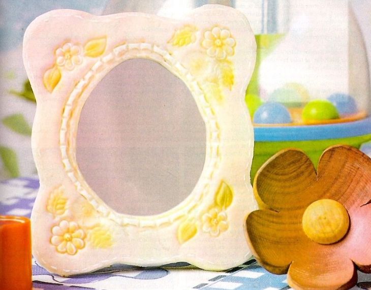 5. Unte el pincel con oleo rosado y descarguelo en un trapo limpio,en circulo hasta que quede seco. Aplique sobre el portarretrato en pinceladas circulares y rapidas. Una vez haya pintado toda la superficie tome un moldeador en forma de flor y presionelo sobre la masa en cada una de las esquinas, pintelas a su gusto con el pincel frio.