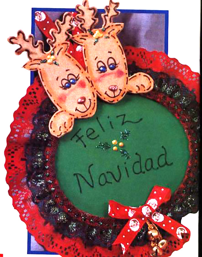 7. Para terminar, pega el encaje al rededor de la base y puntea el contorno interior con pintura luminosa verde como sse aprecia en fotografia, corta tres tramos de hilo, ensarta los cascabeles, pegalos abajo al centro, has un moño y fija este encima. Pega una lazada de liston en la parte posterior para poder colgarla ¡y viva la navdad!